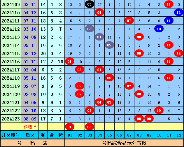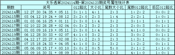 4、前区奖号012路分析:最近9期前区012路比为23:16:6,其中012路分别轮空:1次、1次和6次,最近3期前区012路比为10:3:2,本期注意012路基本平衡,参考012路比2:1:2。